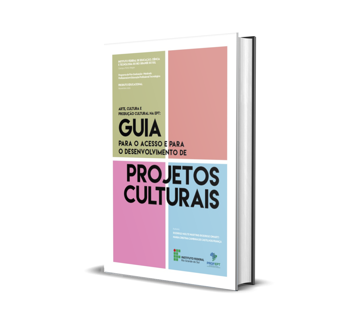 ![O produto educacional “Arte, Cultura e Produção Cultural na EPT: Guia para o Acesso e o Desenvolvimento de Projetos Culturais” é um guia sobre arte, criatividade, produção cultural e suas possibilidades na Educação Profissional e Tecnológica. Desenvolvida no projeto de Mestrado em Educação Profissional e Tecnológica (ProfEPT), do Instituto Federal do Rio Grande do Sul, campus Porto Alegre, a pesquisa buscou o diálogo entre arte, indústria cultural, mundo trabalho e a EPT. Como metodologia, o trabalho se configurou como uma pesquisa qualitativa e de natureza aplicada, através de entrevistas semiestruturadas e interações mediadas tecnologicamente com interlocutores do Campus Osório, do Instituto Federal do Rio Grande do Sul. O objetivo do guia é apresentar noções sobre produção cultural e alternativas de aplicação no âmbito escolar do ensino médio. O trabalho contribui para a aproximação entre arte e EPT, além de destacar a importância do estudo e da aplicação da produção cultural no âmbito escolar.]() Arte, Cultura e Produção Cultural na EPT: guia para o acesso e para o desenvolvimento de projetos culturais |