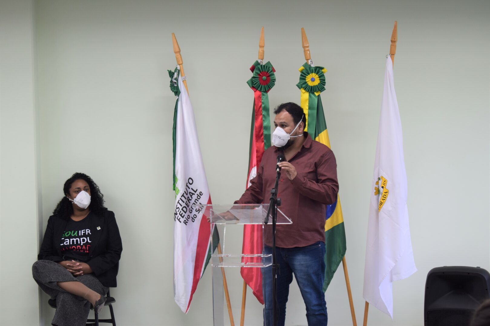 O diretor-geral do Campus Alvorada iniciou sua fala destacando nomes de alguma pessoas que se envolveram no processo de construção da quadra a fim de reconhecer e demonstrar que a complexidade dos institutos federais (IFs) acontece com muita gente comprometida com a educação pública, o que não foi diferente na obra. Entre os nomes, mencionou os colegas servidores das pró-reitorias de Desenvolvimento Institucional e de Administração e Planejamento e da Diretoria de Administração do Campus e da deputada federal Maria do Rosário, que destinou parte do recurso financeiro à edificação da quadra.