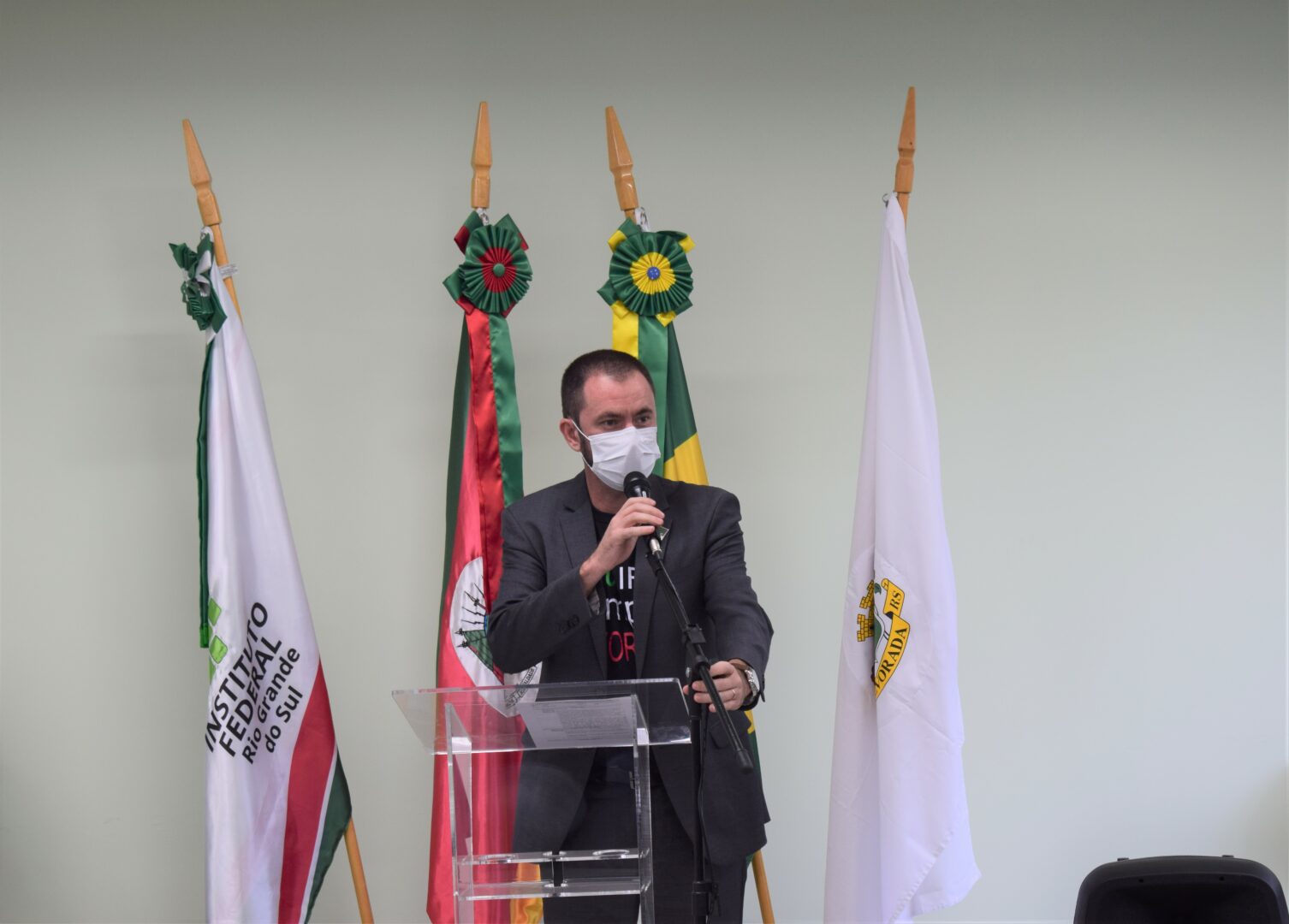 O reitor do IFRS, Júlio Xandro Heck, em seu pronunciamento, ressaltou dois motivos especiais que tornaram a solenidade um momento de muita alegria. O primeiro, a presencialidade do ato, o contato, o olhar, a possibilidade de conversar pessoalmente após quase dois anos de isolamento e trabalho remoto. E o segundo, a inauguração da quadra que, de acordo com o docente, é um aparelho público, pois será de uso de toda a comunidade, de todo o território, não só dos estudantes e servidores do Campus Alvorada.