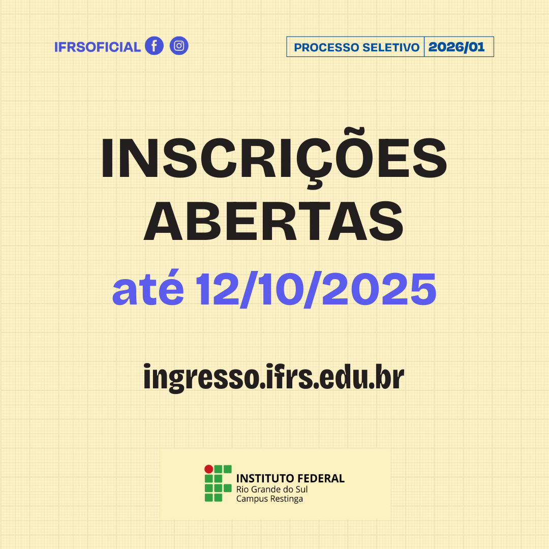 ➡️ Está aberto até 12 de outubro de 2025 o período de inscrições para o Processo Seletivo de estudantes 2026/01 do Instituto Federal de Educação, Ciência e Tecnologia do Rio Grande do Sul (IFRS). São mais de 5.700 vagas em 183 opções de cursos gratuitos. 📝 O Campus Restinga oferece 228 vagas em cursos técnicos integrados ao ensino médio, que…
