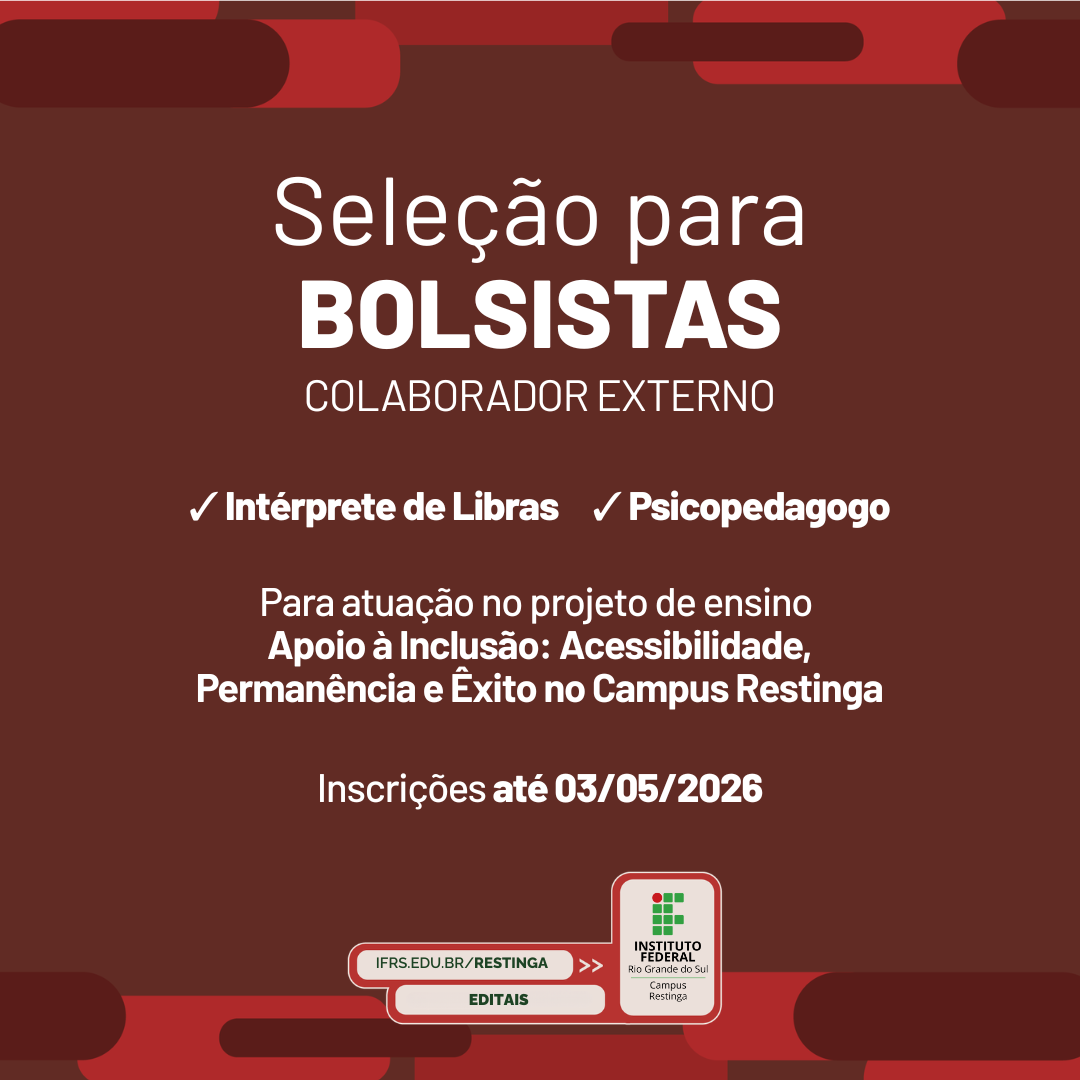 Estão abertas até 03 de maio de 2026 as inscrições para seleção de bolsistas, na modalidade colaborador externo, para atuarem no projeto de ensino intitulado “ Apoio à Inclusão: Acessibilidade, Permanência e Êxito no Campus Restinga. São 06 vagas para a função de Intérprete de Libras e 02 para a função de Psicopedagogo, com carga horária de 20h ou 40h semanais.