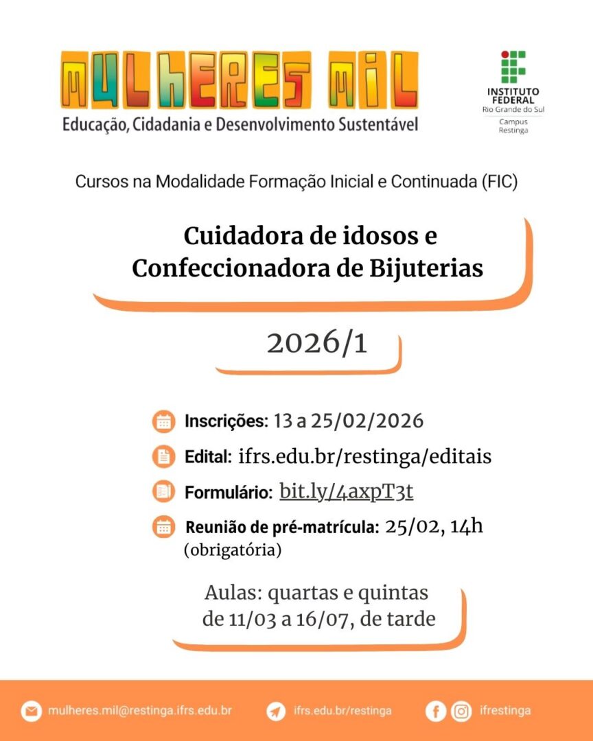 Estão abertas as inscrições para a segunda edição dos cursos de Cuidadora de Idosos e de Confeccionadora de Bijuterias do Programa Mulheres Mil do Campus Restinga. As inscrições acontecem até o dia 25/02, pelo link http://bit.ly/4axpT3t. As candidatas deverão participar obrigatoriamente de reunião de pré-matrícula no dia 25/02, às 14h, no Campus Restinga, onde o programa e o curso serão apresentados e será realizada a pré-matrícula nos cursos. Em caso de sobra de vagas, haverá um segundo período de inscrições, até 04/03, com nova reunião de pré-matrícula no dia 04/03, às 14h.