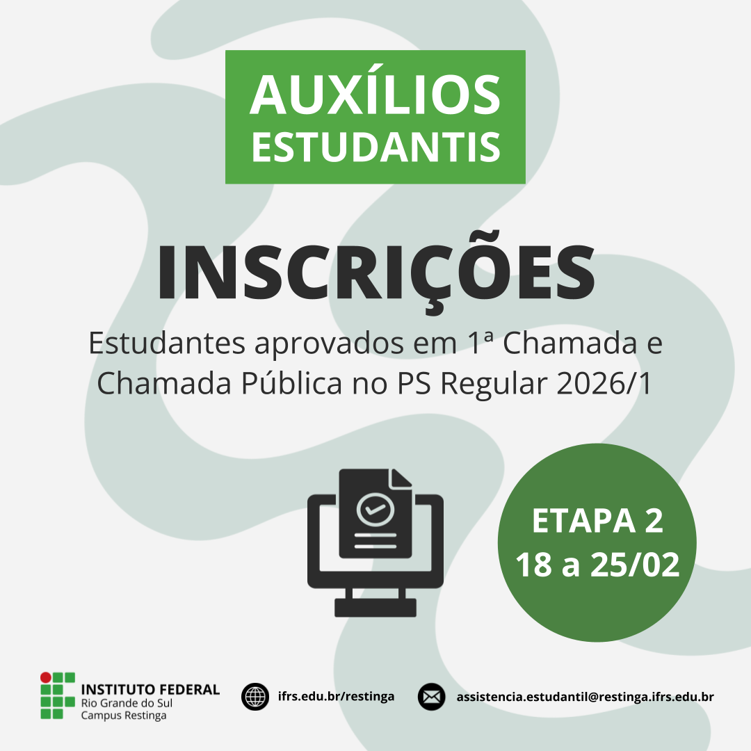 Estudantes que estão ingressando no Campus Restinga em 2026/01 podem se inscrever no edital de Auxílios Estudantis. As inscrições estarão abertas de 18 a 25 de fevereiro de 2026 através do Sistema de Inscrições de Auxílios.