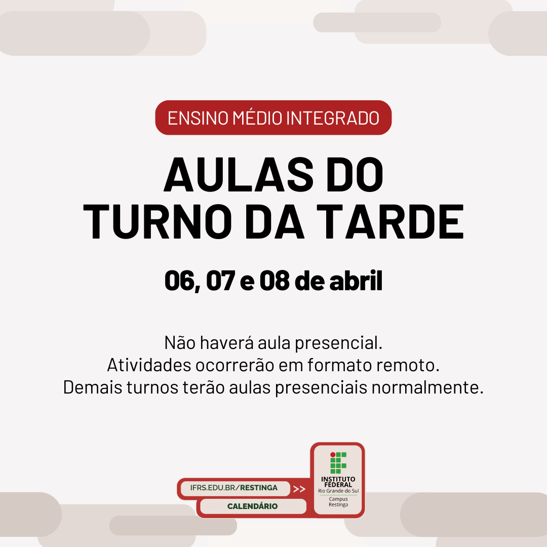 Aviso: não haverá aula presencial no turno da tarde do Ensino Médio Integrado nos dias 06, 07 e 08 de abril