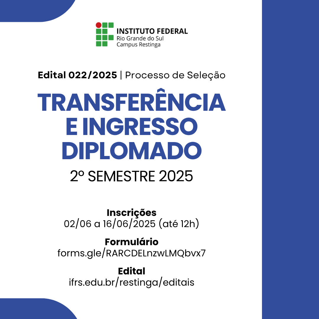 Estão abertas de 25 de novembro a 04 de dezembro de 2025 (até as 12h) as inscrições para o edital de Transferência e Ingresso Diplomado 2026/1. Há vagas para os cursos Tecnologia em Análise e Desenvolvimento de Sistemas, Tecnologia em Processos Gerenciais, Tecnologia em Agroecologia e Licenciatura em Letras Português e Espanhol. As inscrições devem ser feitas pelo formulário eletrônico, juntamente…