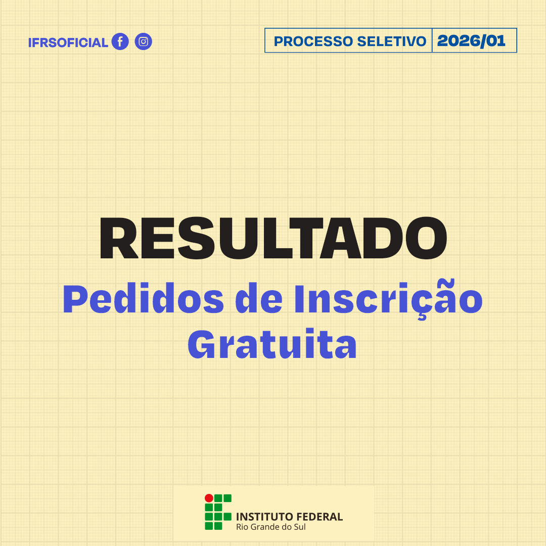 📌 Estão publicadas as listas com os resultados dos pedidos de gratuidade da inscrição (isenção da taxa) do Processo Seletivo de estudantes 2026/01 do Instituto Federal de Educação, Ciência e Tecnologia do Rio Grande do Sul (IFRS).