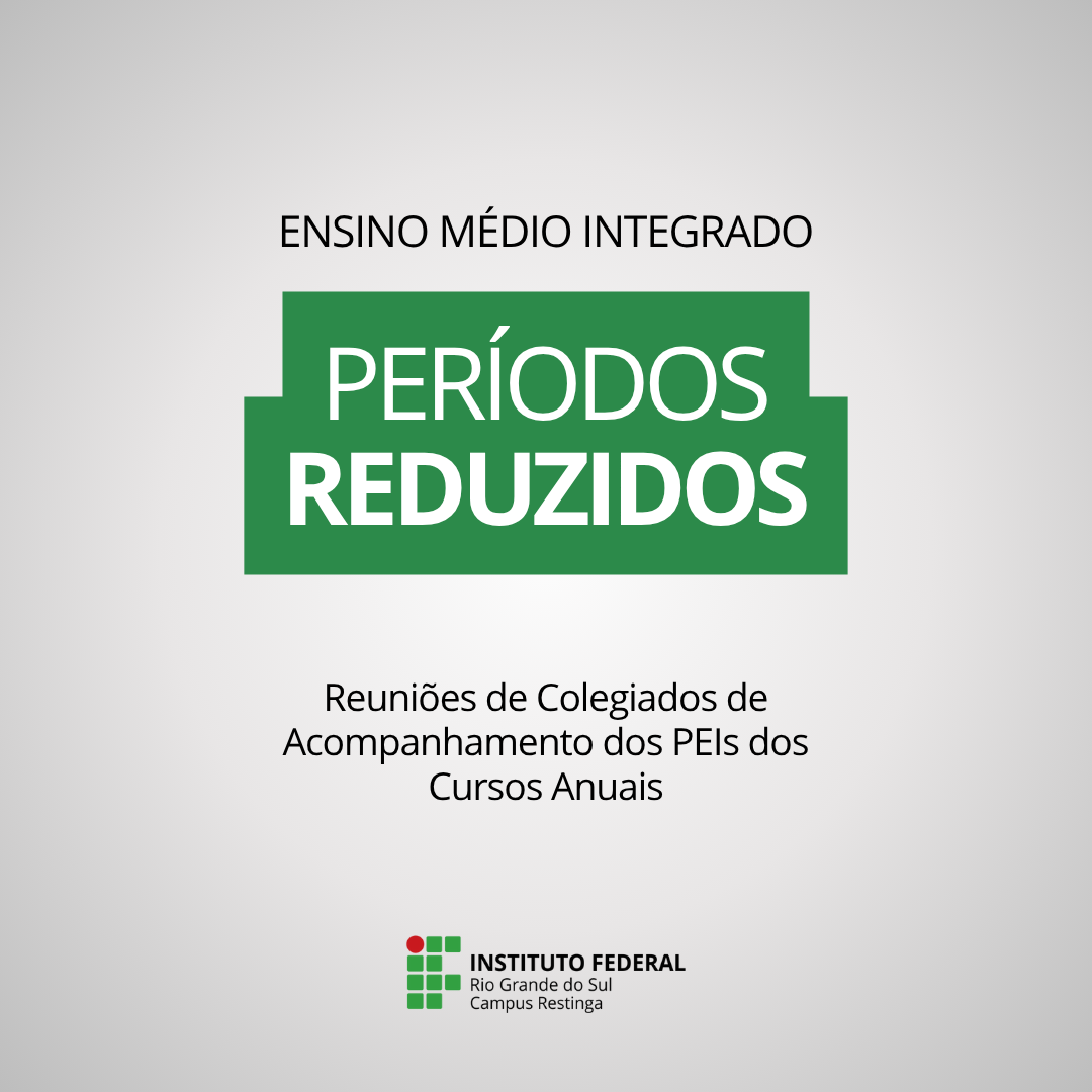 [ATUALIZADO] A Gestão de Ensino informa que, conforme o calendário acadêmico, haverá a redução dos períodos de aula para os cursos de Ensino Médio Integrado (EMI) anuais nos dias 04, 05, 06 e 10 de novembro de 2025, devido à convocação das(os) docentes para as Reuniões de Colegiados de Acompanhamento dos PEIs dos Cursos Anuais.