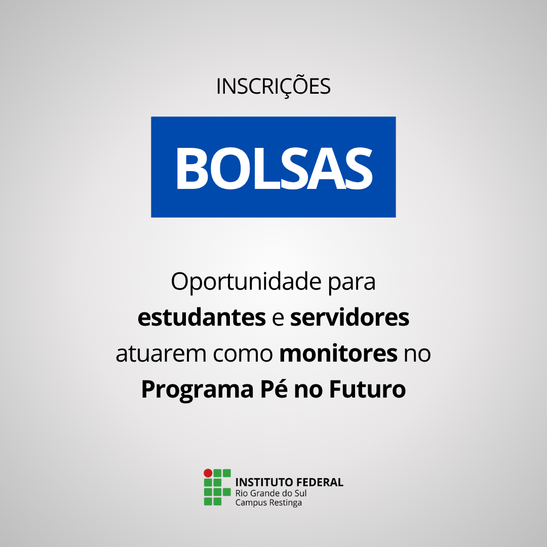 Estão abertas até 02 de novembro de 2025 as inscrições para o edital de seleção de monitores para a formação no Programa Pé no Futuro no Instituto Federal de Educação, Ciência e Tecnologia do Rio Grande do Sul (IFRS). Estudantes e servidores podem participar.