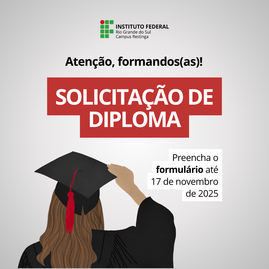 Está aberto até o dia 17 de novembro de 2025 o período para solicitação de diploma pelos concluintes de curso no semestre 2025/2. Quem está concluindo o curso neste semestre deve preencher o formulário eletrônico, anexando todos os documentos corretamente.