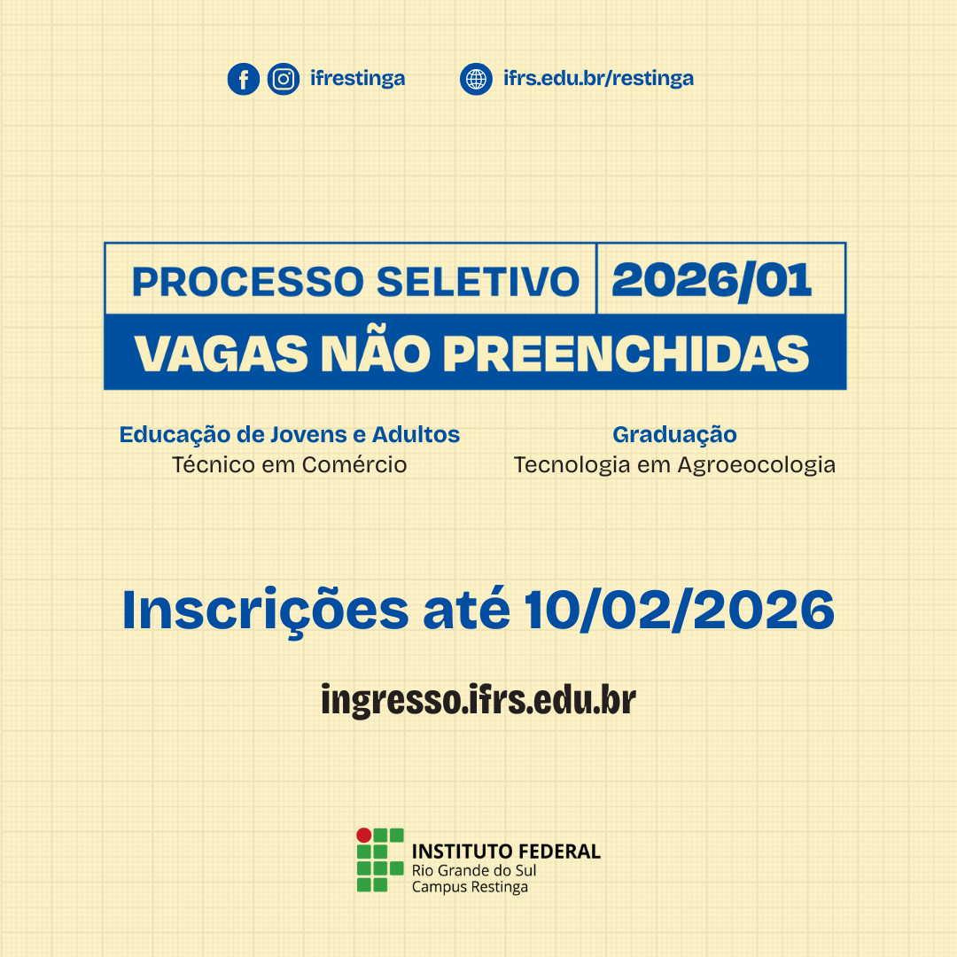 Confira todas as informações no Edital nº 03/2026, publicado no site ingresso.ifrs.edu.br.