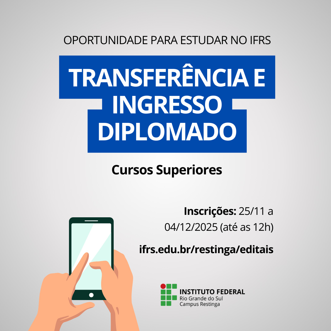 Estão abertas de 25 de novembro a 04 de dezembro de 2025 (até as 12h) as inscrições para o edital de Transferência e Ingresso Diplomado 2026/1. Há vagas para os cursos Tecnologia em Análise e Desenvolvimento de Sistemas, Tecnologia em Processos Gerenciais, Tecnologia em Agroecologia e Licenciatura em Letras Português e Espanhol.