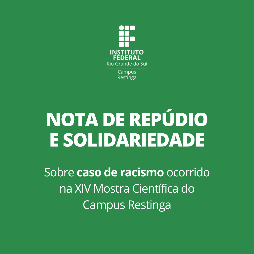 O Campus Restinga do Instituto Federal do Rio Grande do Sul (IFRS) manifesta seu profundo repúdio a um ato de racismo ocorrido durante a XIV Mostra Científica, evento realizado nos dias 16 e 17 de outubro.