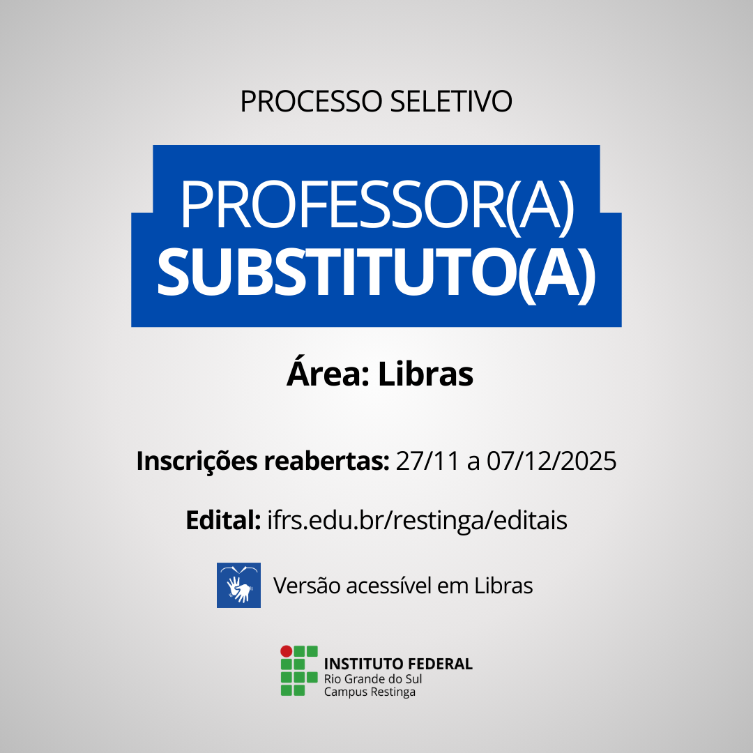 Foi reaberto o período de inscrição para o Processo Seletivo Simplificado para contratação de professor(a) substituto(a) da área de Libras. As inscrições poderão ser realizadas, via formulário eletrônico, de 27 de novembro a 07 de dezembro de 2025.