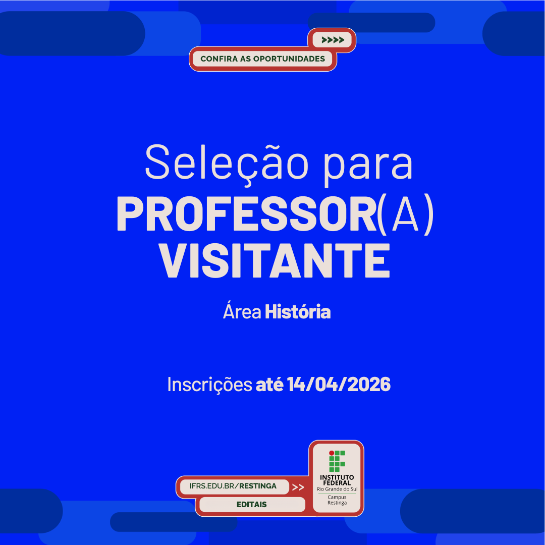 O Campus Restinga está com seleção aberta para contratação de professor(a) visitante na área de História. As inscrições poderão ser realizadas, via formulário eletrônico, de 07 a 14 de abril de 2026.