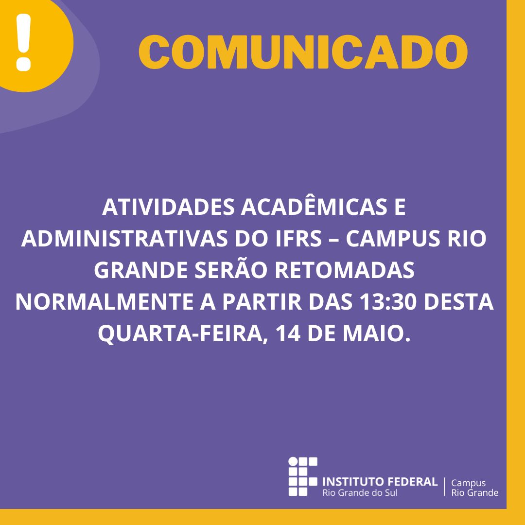 Informamos que as atividades acadêmicas e administrativas do IFRS – Campus Rio Grande serão retomadas normalmente a partir das 13:30 desta quarta-feira, 14 de maio.