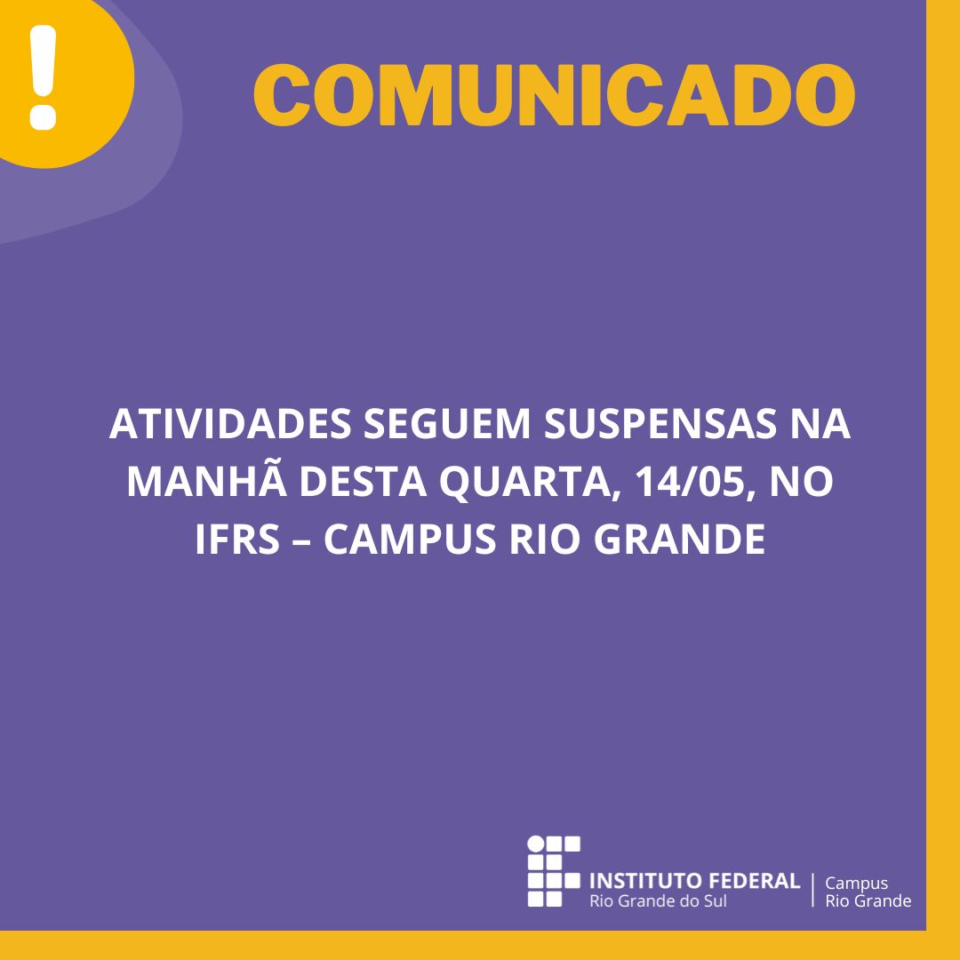 Diante desse cenário, e com o objetivo de evitar eventuais prejuízos a estudantes e servidores, informamos que as atividades acadêmicas e administrativas presenciais permanecerão suspensas no turno da manhã desta quarta-feira, 14 de maio.