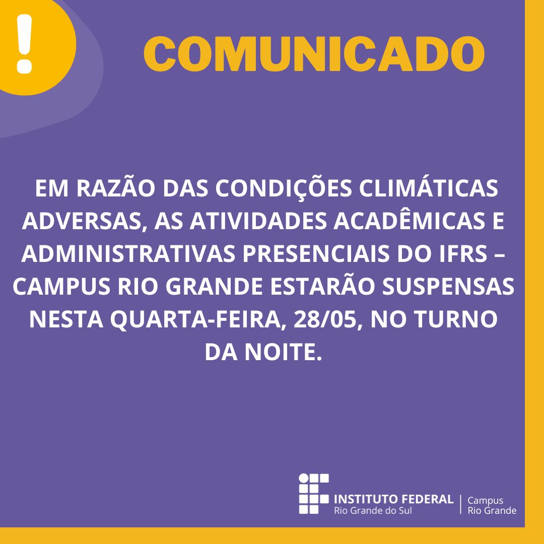 Considerando os alertas de Grande Perigo emitidos pelo Instituto Nacional de Meteorologia em 28/05/2025, bem como os comunicados da Defesa Civil sobre as condições climáticas adversas em nossa região, informamos que as atividades acadêmicas e administrativas presenciais no Campus Rio Grande estarão suspensas no turno da noite desta quarta-feira, 28 de maio de 2025.