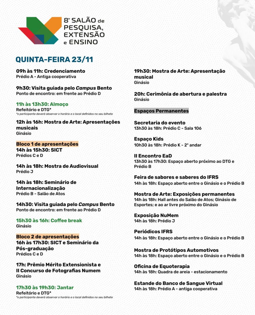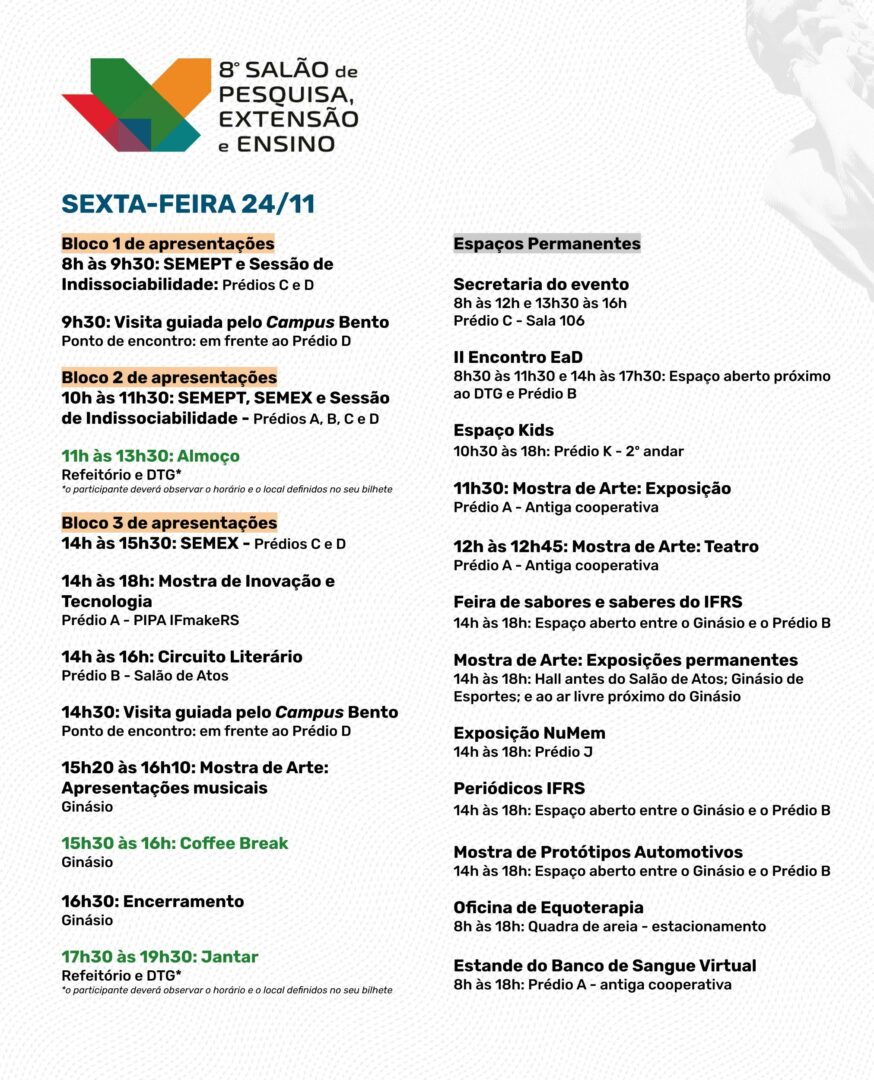 O Salão contemplará os seguintes eventos: 12º Seminário de Iniciação Científica e Tecnológica (SICT); 11º Seminário de Extensão (SEMEX); 10º Seminário de Educação Profissional e Tecnológica (SEMEPT); 8º Seminário de Pós-Graduação; 8º Seminário de Internacionalização; Sessão de Indissociabilidade; Mostra de Inovação e Tecnologias (MIT); Mostra de Protótipos Automotivos; Mostra de Arte; 3º Feira de Sabores e Saberes; 2º Encontro de Educação a Distância; 3º Circuito Literário; 2º Mérito Extensionista; 2º Exposição NuMem: 15 anos de História e Memória do IFRS; Encontro de Periódicos. O evento terá, mais uma vez, o Espaço Kids, local lúdico e de acolhimento para todos os participantes.