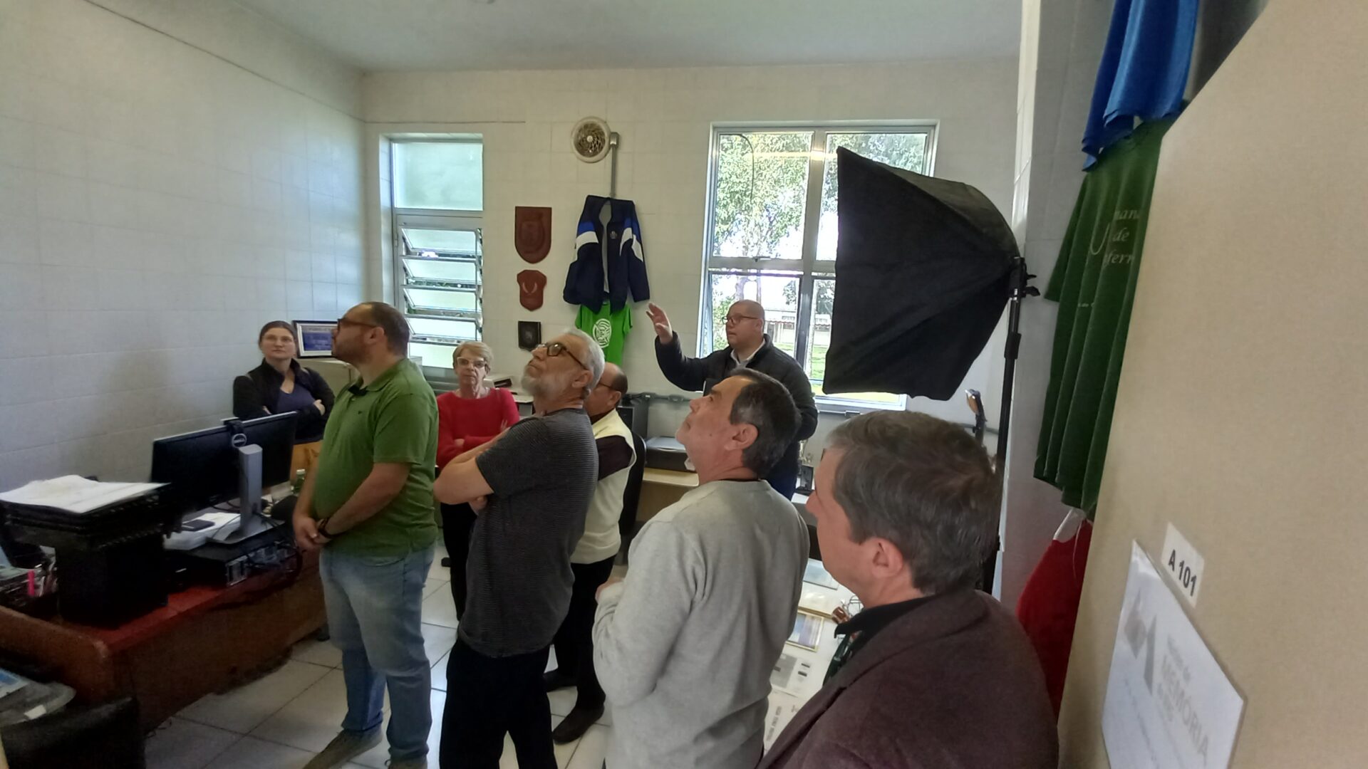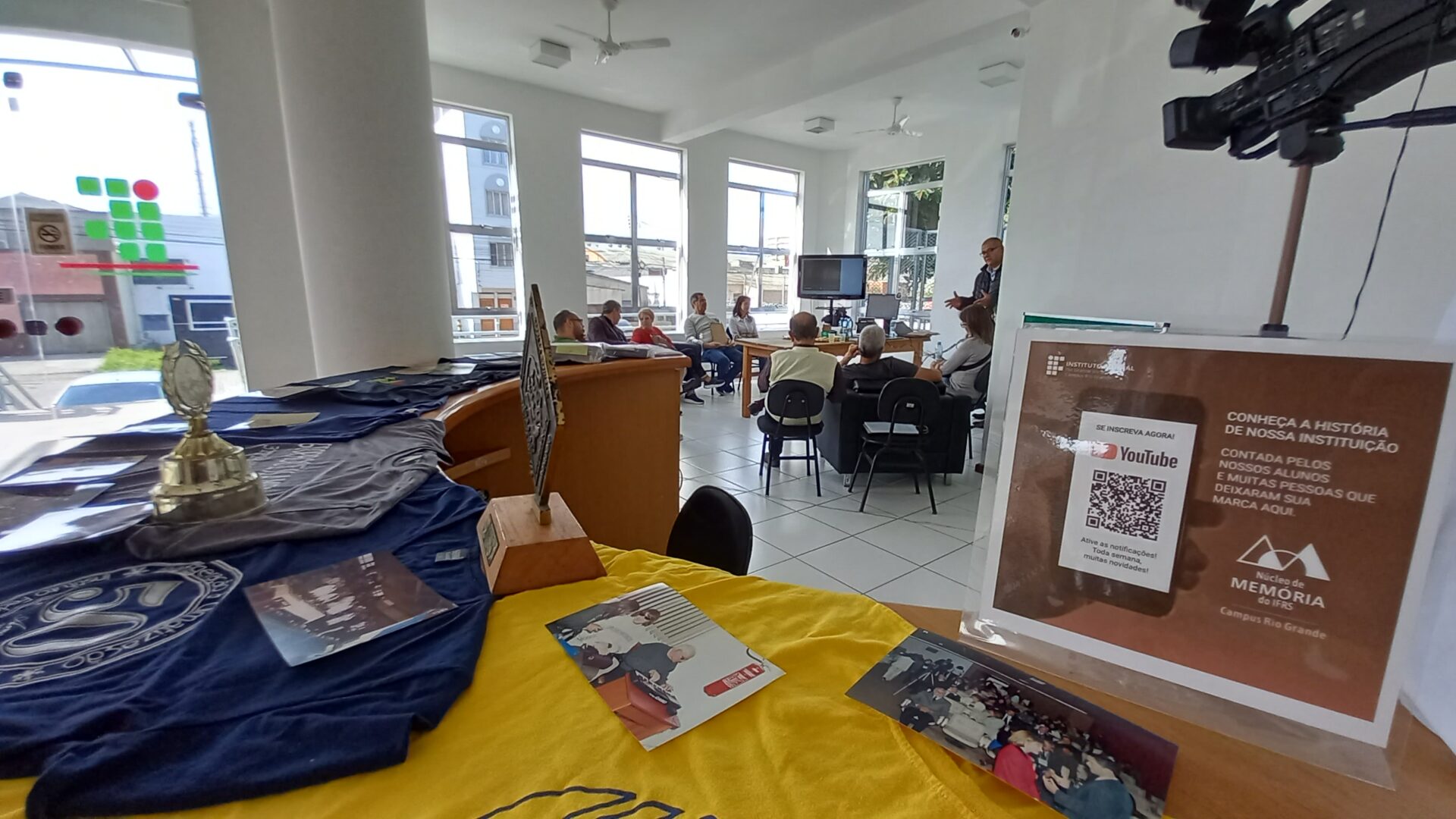 Depois de os recebermos no gabinete da Direção Geral, a visita se encaminhou para o espaço de exposições do NUMEM IFRS-RG, localizado ao lado da sala da Direção de Ensino, para visitação de nossa linha do tempo exposta em fotos e artefatos.