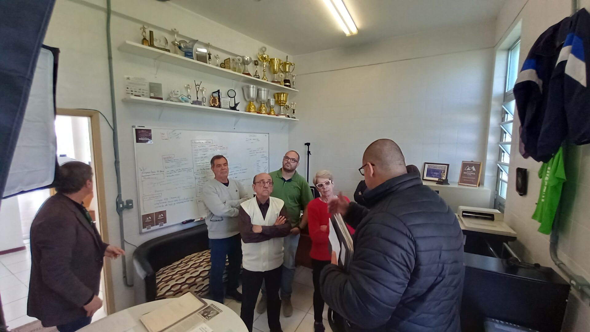 Na sequência, a equipe do NuMe/FURG se deslocou até a Sala A-101, localizada no Anfiteatro Earle Barros, espaço este de administração, salvaguarda de acervo museológico e arquivístico, gravações, edição e catalogação de mídias do NUMEM IFRS-RG.