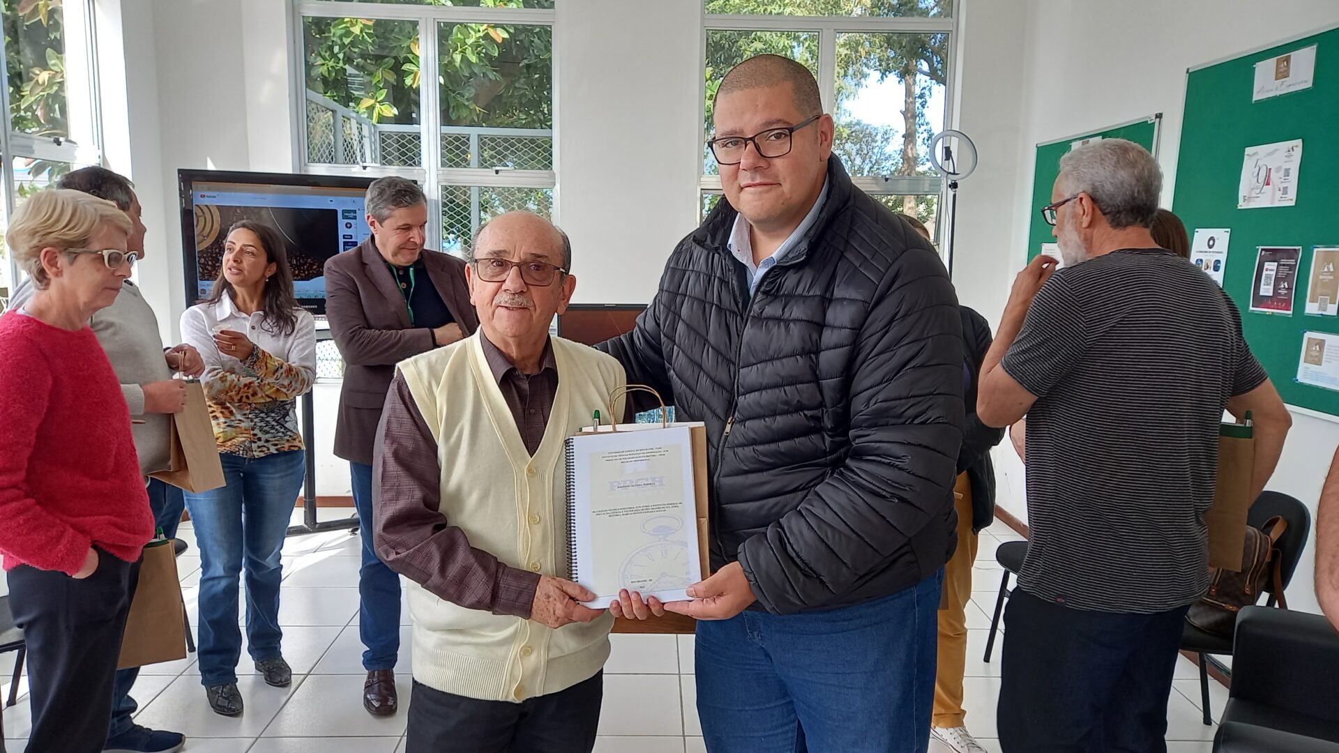 Todos os membros presentes do NuME/FURG receberam um material institucional contendo o regulamento do NUMEM IFRS-RG, aprovado no CONSUP em 2018, e uma via impressa da dissertação de Mestrado (PPGH/FURG), sobre a história institucional CTI/IFRS, de Jerônimo Silveira Maiorca (2023), foi entregue em mãos ao presidente Péricles.