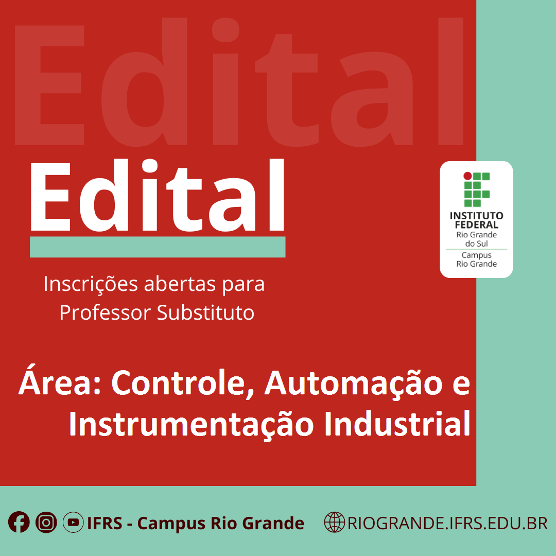 Link para o edital: https://ifrs.edu.br/riogrande/editais/edital-09-2026-processo-seletivo-simplificado-para-contratacao-de-professor-substituto-area-controle-automacao-e-instrumentacao-industrial/