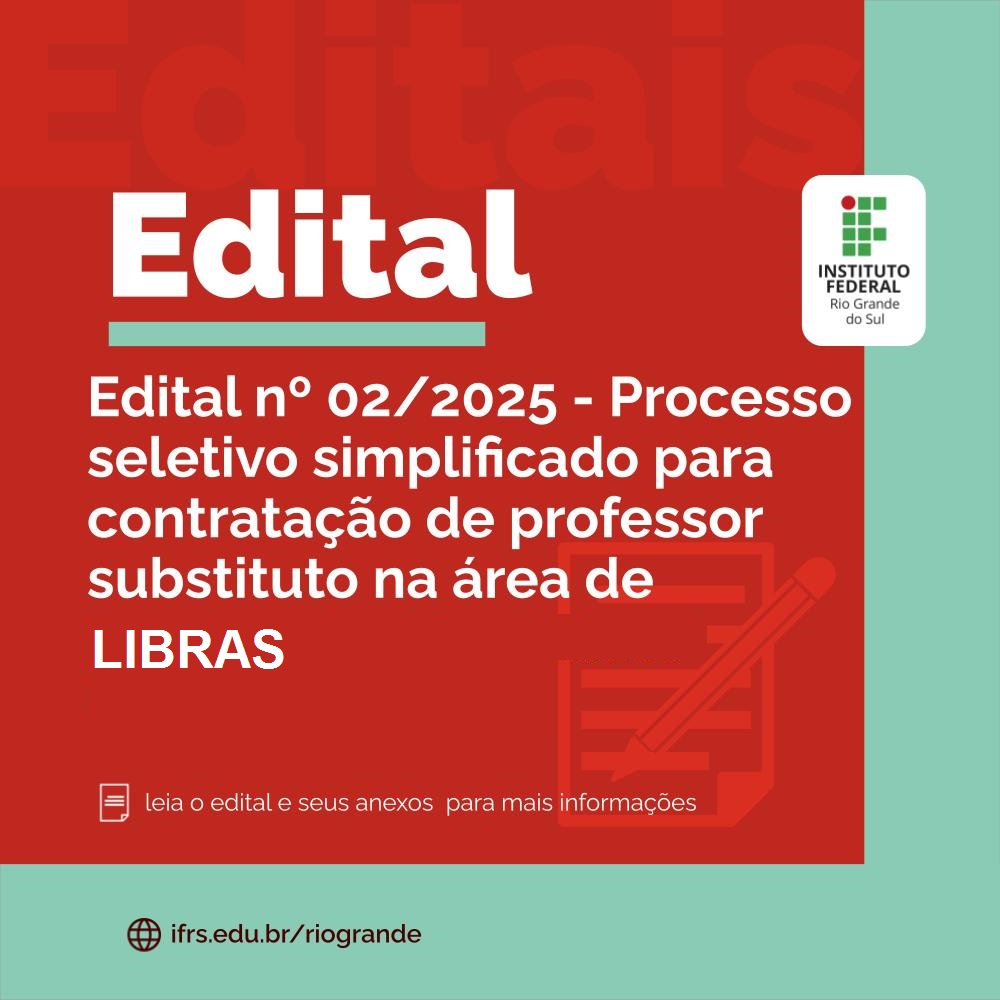 Link para o edital: https://ifrs.edu.br/riogrande/editais/edital-no-28-2025-processo-seletivo-simplificado-para-contratacao-de-professor-substituto-area-libras/