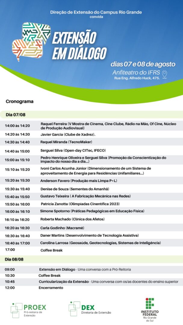 Entre os dias 07 e 08 de agosto haverá o “Extensão em Diálogo”, proposta de evento itinerante da Pró-reitoria de Extensão (PROEX) que visita cada campus do IFRS para falar sobre extensão e conhecer as ações desenvolvidas, oportunidade para que toda a comunidade também conheça o que se faz de extensão em nosso campus.