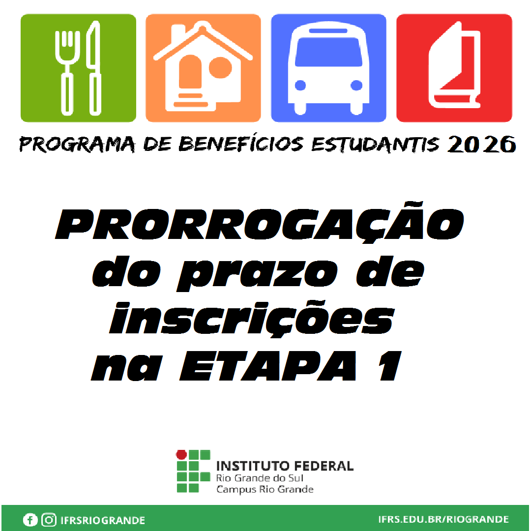 A Assistência Estudantil informa à comunidade acadêmica a PRORROGAÇÃO do prazo de inscrições na ETAPA 1 do Edital de Auxílios Estudantis para o ano de 2026. Os estudantes que ingressaram por chamada pública, vagas remanescentes ou que vieram a não realizar a inscrição no período original poderão realizar seu pedido através do Sistema de Auxílios Estudantis – https://ensino.ifrs.edu.br/auxilioestudantil – de hoje, 20/03 até o dia 25/04.