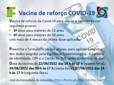 O NAS em parceria com a Vigilância Epidemiológica (VE) do município irá dispôr a vacina de reforço da Covid-19 para os interessados da comunidade acadêmica, que se encaixem nos grupos: 3ª dose para maiores de 12 anos e 4ª dose para maiores de 50 anos, desde que todos com mais de 4 meses da última dose aplicada.