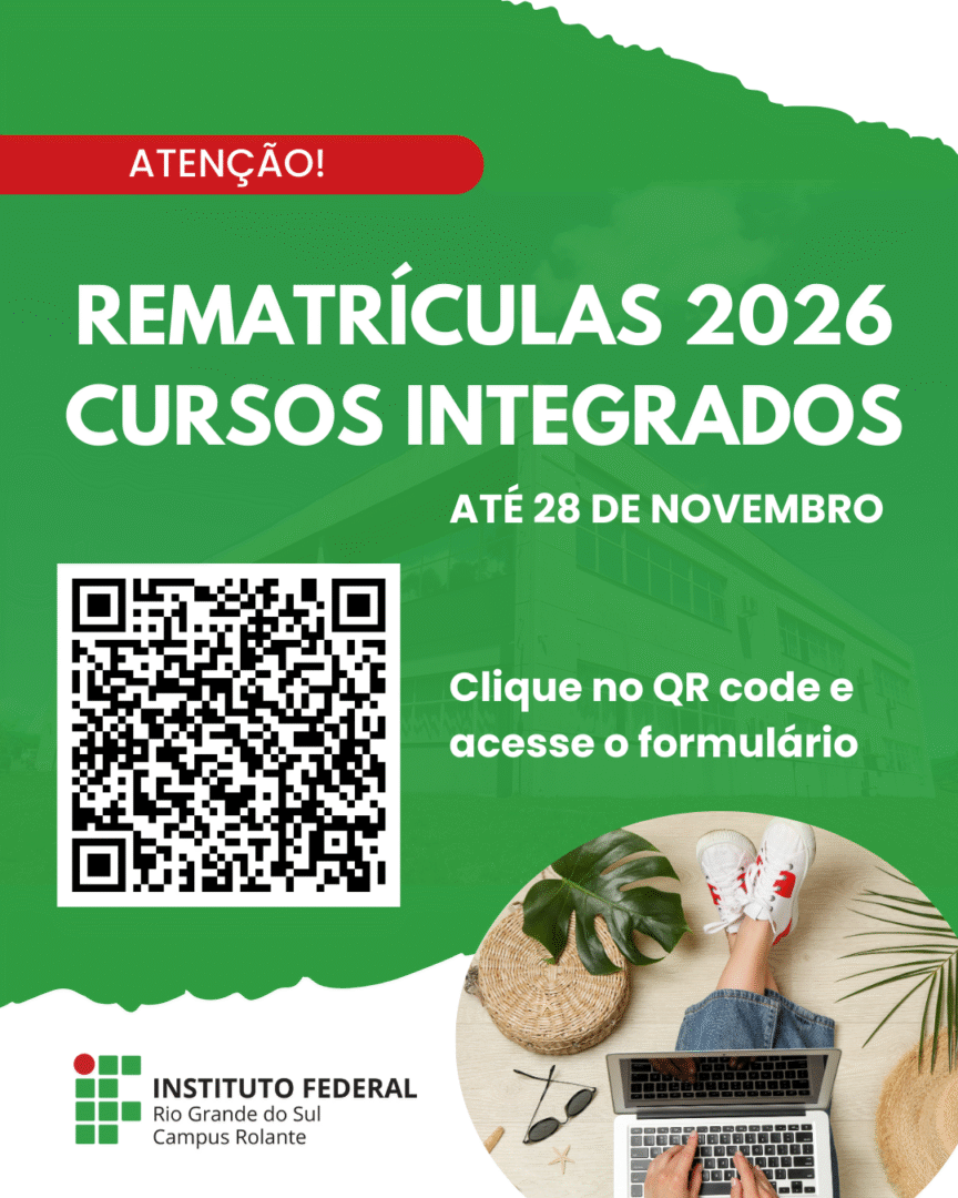 O IFRS Campus Rolante informa que as rematrículas dos cursos técnicos integrados para o ano letivo 2026 ocorrem até o dia 28 de novembro de 2025, por meio de formulário eletrônico que pode ser acessado aqui.