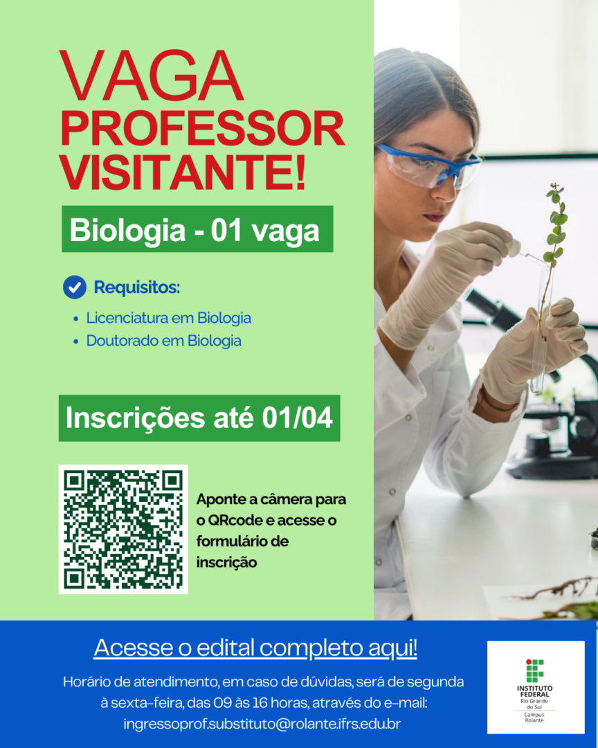 O IFRS Campus Rolante informa que está publicado o Edital Nº 06/2026 – Processo Seletivo Simplificado para contratação de professor visitante. O edital disponibiliza 01 vaga (ampla concorrência – 40h) para candidatos com Licenciatura em Biologia e Doutorado em Biologia.