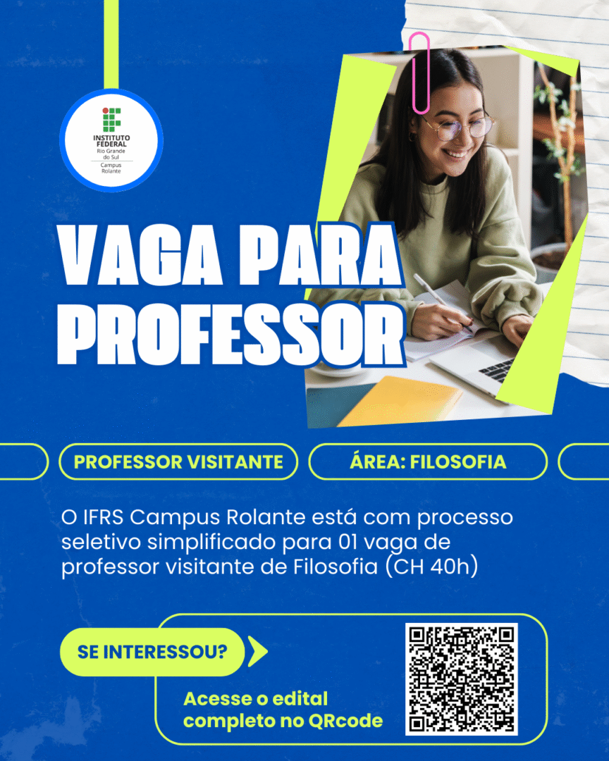 O IFRS Campus Rolante informa que está publicado o Edital Nº 02 /2026 – Processo Seletivo Simplificado para contratação de professor visitante. O edital disponibiliza 01 vaga (ampla concorrência – 40h) para candidatos com Licenciatura em Filosofia e Doutorado em Filosofia.