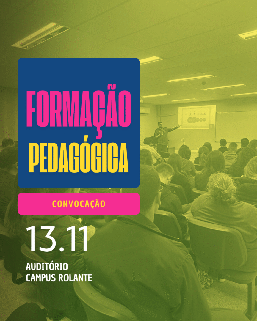 De acordo com o Ofício Nº 73/2025, os docentes e técnicos administrativos vinculados ao Setor de Ensino do Campus Rolante estão convocados para a Formação Pedagógica. Os demais servidores estão convidados a participarem da programação enviada via e-mail institucional.