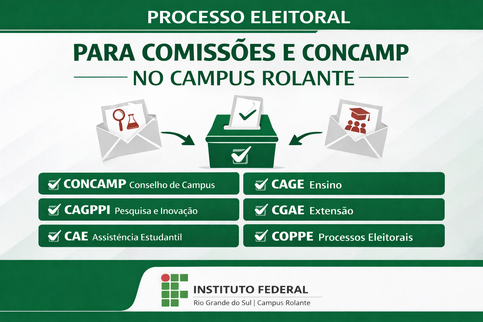 O Campus Rolante do Instituto Federal do Rio Grande do Sul (IFRS) publicou o Edital nº 07/2026, que regulamenta o processo eleitoral para a escolha de representantes docentes, técnico administrativos em educação, discentes e da comunidade externa para a composição de comissões institucionais e do Conselho de Campus (Concamp).