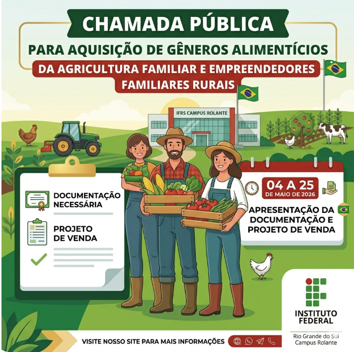 O Instituto Federal de Educação, Ciência e Tecnologia do Rio Grande do Sul (IFRS) – Campus Rolante publicou o Edital de Chamada Pública PNAE nº 5/2026, com o objetivo de adquirir gêneros alimentícios diretamente da agricultura familiar e de empreendedores familiares rurais.