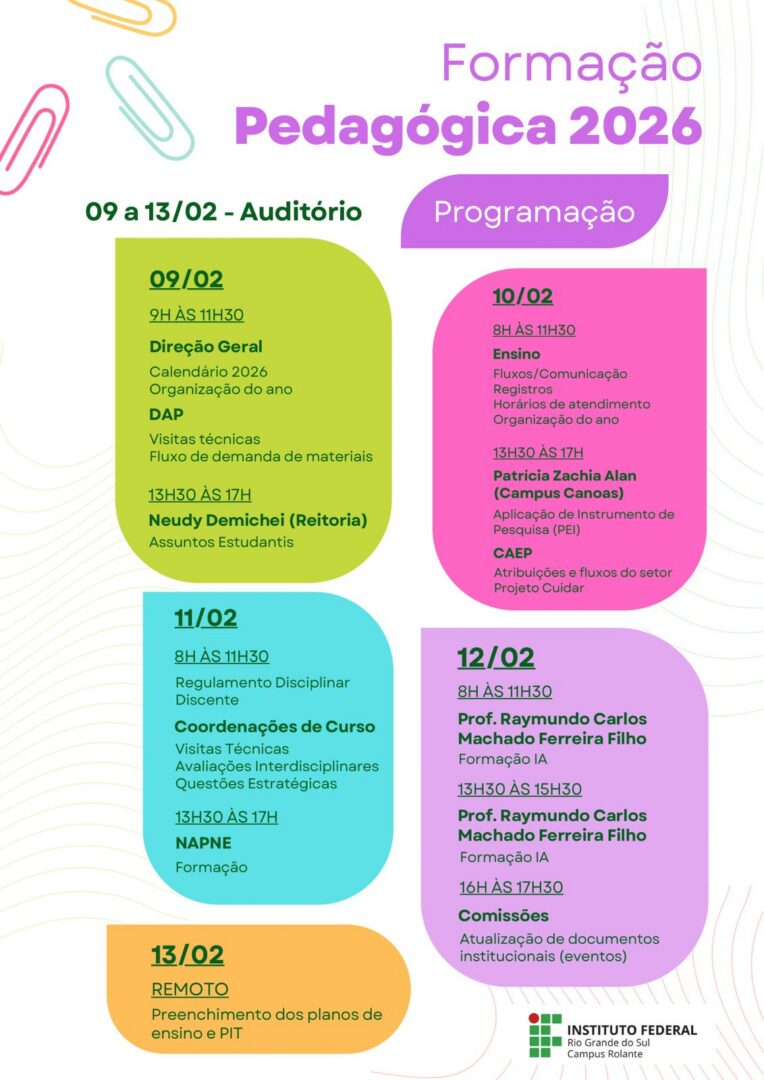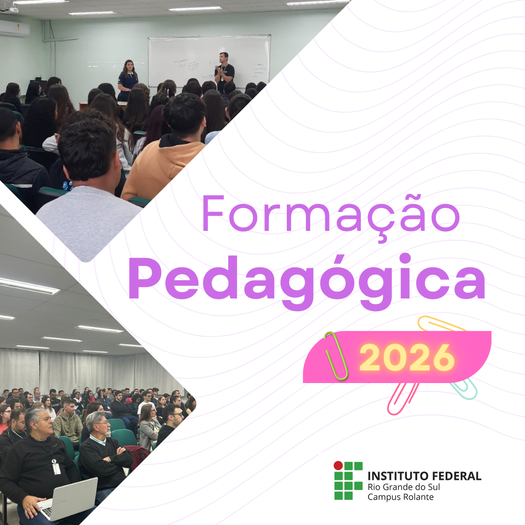 O IFRS Campus Rolante promove entre os dias 09 e 13 de fevereiro a Formação Pedagógica 2026 no Auditório da instituição.