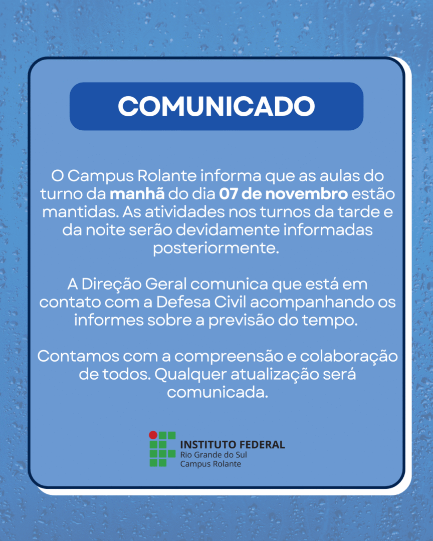 O Campus Rolante informa que as aulas do turno da manhã do dia 07 de novembro estão mantidas. As atividades nos turnos da tarde e da noite serão devidamente informadas posteriormente.