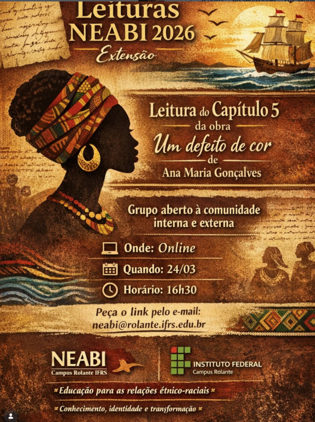O Núcleo de Estudos Afro-Brasileiros e Indígenas (Neabi) do IFRS Campus Rolante convida para duas atividades esta semana. Nesta terça-feira, dia 24 de março de 2026, o núcleo promove uma roda de conversa online sobre o Capítulo 5 da obra Um defeito de cor, de Ana Maria Gonçalves. O grupo de estudos é aberto às comunidades interna e externa do Campus Rolante.