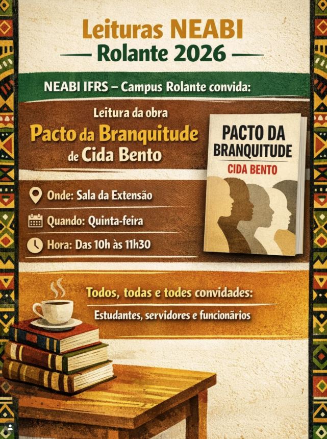 O outro evento está marcado para quinta-feira, dia 26 de março de 2026, na sala da Coordenação de Extensão do Campus Rolante, andar térreo, das 10h às 11h30min. Intitulado Leituras Neabi Rolante 2026, o evento vai abordar a leitura da obra Pacto da Branquitude, de Cida Bento. Estudantes e servidores do Campus Rolante estão convidados a participar da ação.