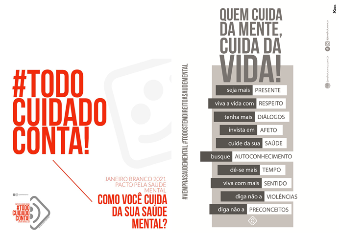 Legenda da imagem: Cartaz da campanha Janeiro Branco com os dizeres “Todo cuidado conta! Como você cuida da sua saúde mental?”, “Quem cuida da mente, cuida da vida! Seja mais presente. Viva a vida com respeito. Tenha mais diálogos. Invista em afeto. Cuide da sua saúde. Busque autoconhecimento. Dê-se mais tempo. Viva com mais sentido. Diga não a violências. Diga não a preconceitos.”