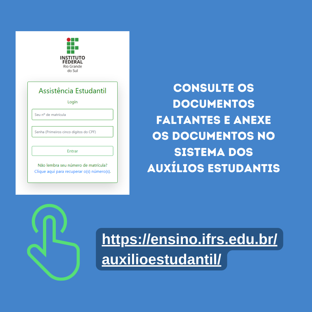 Devido a instabilidade do Sistema de Auxílios Estudantis do IFRS, o período de Complementação de Documentos foi estendido. Os estudantes têm até 28/08 para acessar as listas de estudantes que necessitam complementar documentos referentes à solicitação dos Auxílios Estudantis de 2024, inscritos na 3ª Etapa do Edital nº 38/2023.