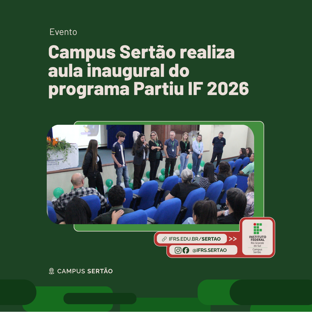 A segunda turma do programa Partiu IF iniciou as atividades oficialmente na noite desta quarta-feira (15). Uma aula inaugural marcou o início das atividades da turma de 2026. A solenidade ocorreu às 19h, no Auditório Leocyr Dornelles Minussi e reuniu estudantes, familiares, autoridades e servidores da instituição. Estiveram presentes o diretor-geral do Campus Sertão, Clever Variani; o coordenador do Departamento de Desenvolvimento Institucional, Márcio Luis Vieira; a coordenadora substituta do Departamento de Extensão, Ivone Taderka; e o coordenador local do Partiu IF, Rodrigo Ferronato Beatrici.