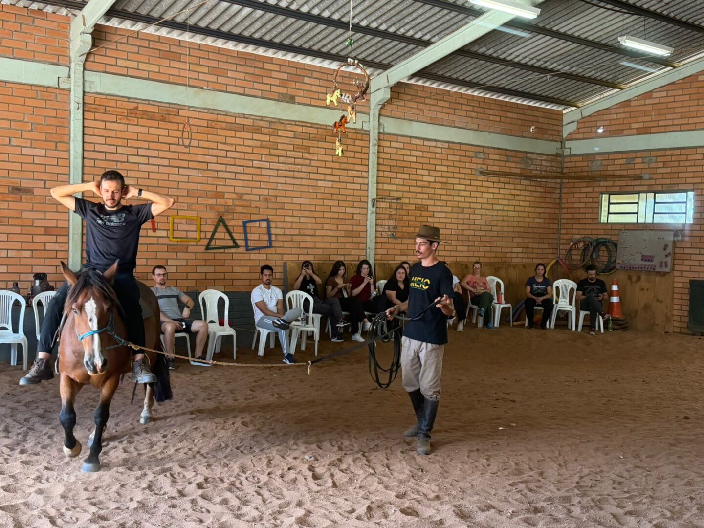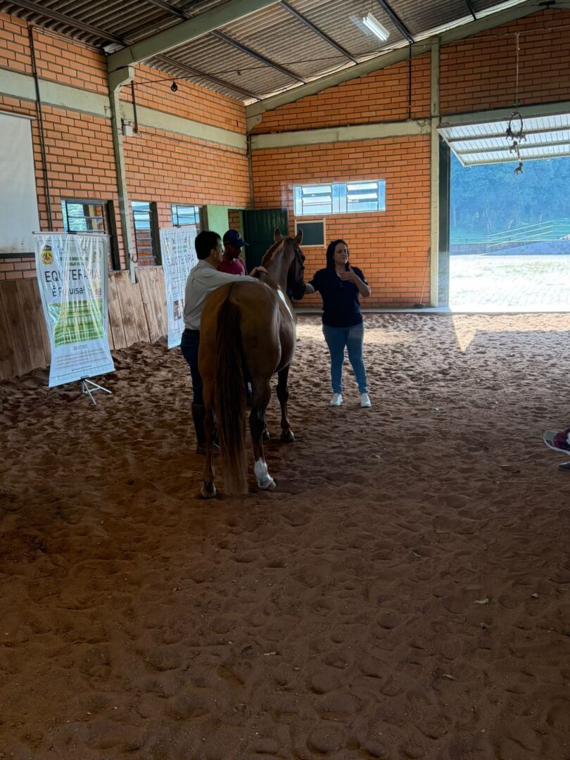 Também foram abordados aspectos fundamentais da prática, como a atuação de equipes multidisciplinares, técnicas de manejo, incluindo monta e condução, além da relação entre humanos e equinos no contexto terapêutico. A atividade proporcionou um espaço de troca de conhecimentos e contribuiu para a qualificação das iniciativas voltadas à equoterapia na região.