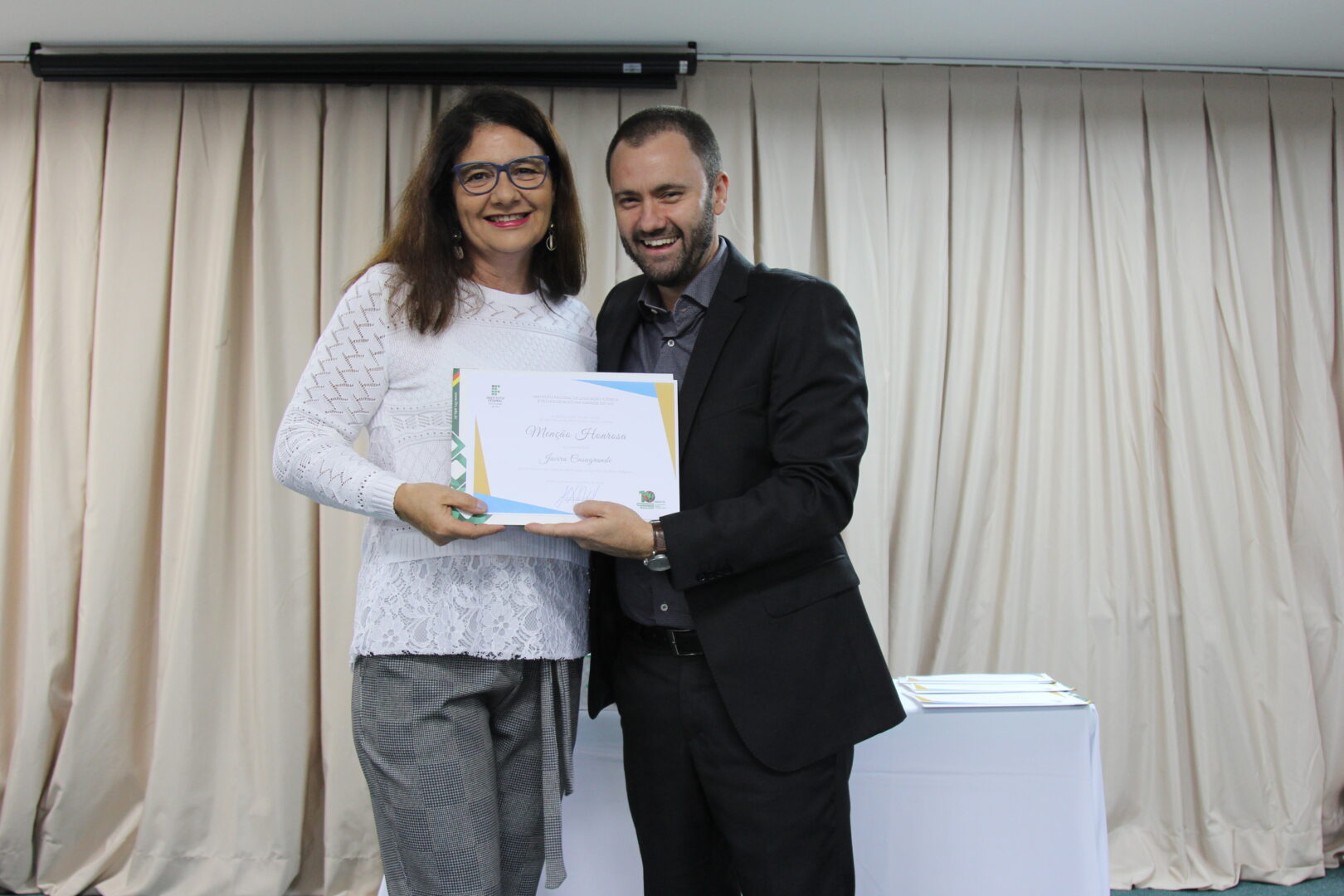 Jacira, de Bento Gonçalves, recebeu do reitor, Júlio Xandro Heck, o certificado de “Servidor 10 anos” no aniversário de uma década do IFRS, em 2018