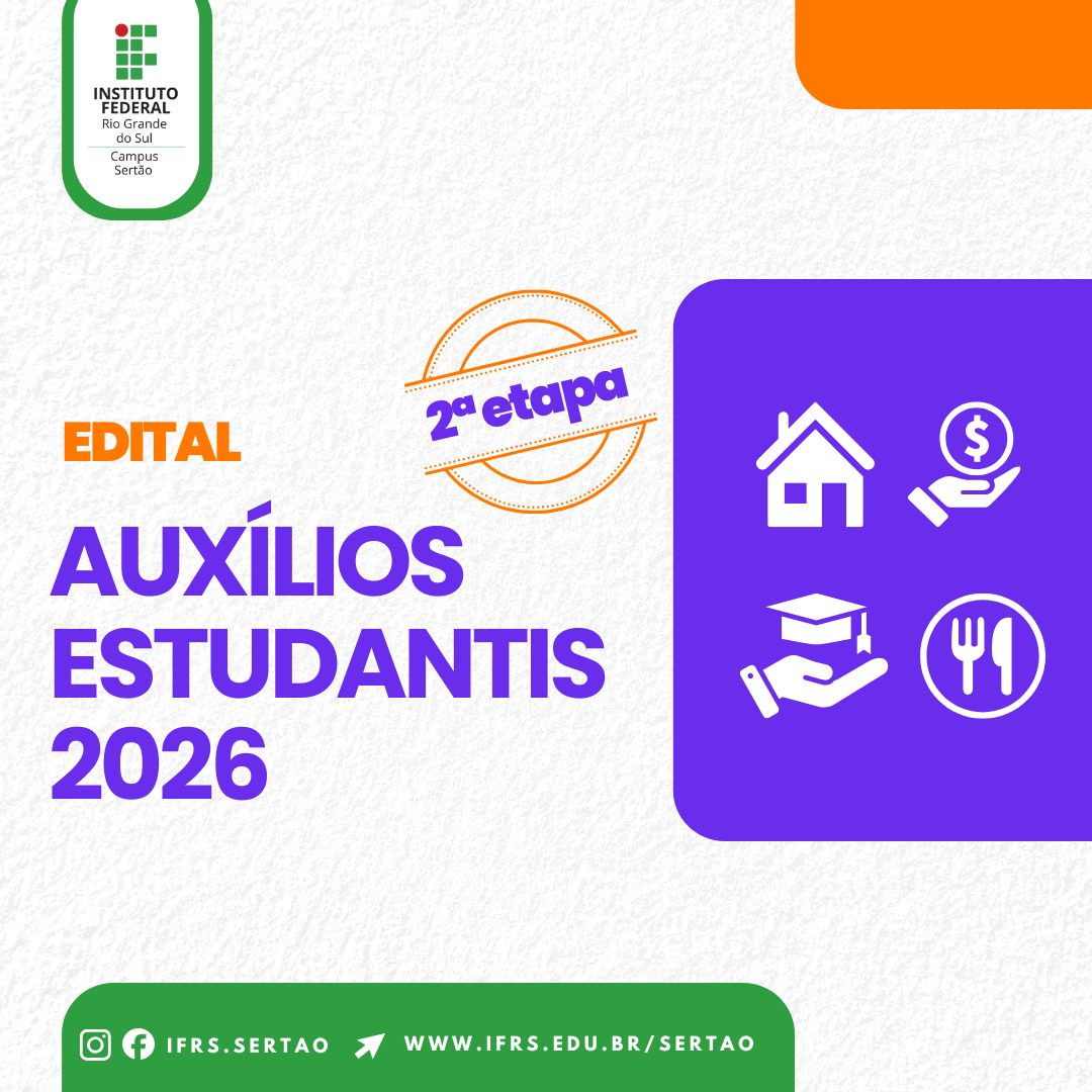 Os estudantes ingressantes no Campus Sertão, que foram aprovados em primeira chamada ou na Chamada Pública do Processo Seletivo 2026/1, devem ficar atentos aos prazos da segunda etapa dos Auxílios Estudantis referente ao ano letivo de 2026. A segunda etapa é destinada exclusivamente a esse público e ocorre no período de 02 de fevereiro a 24 de fevereiro de 2026.