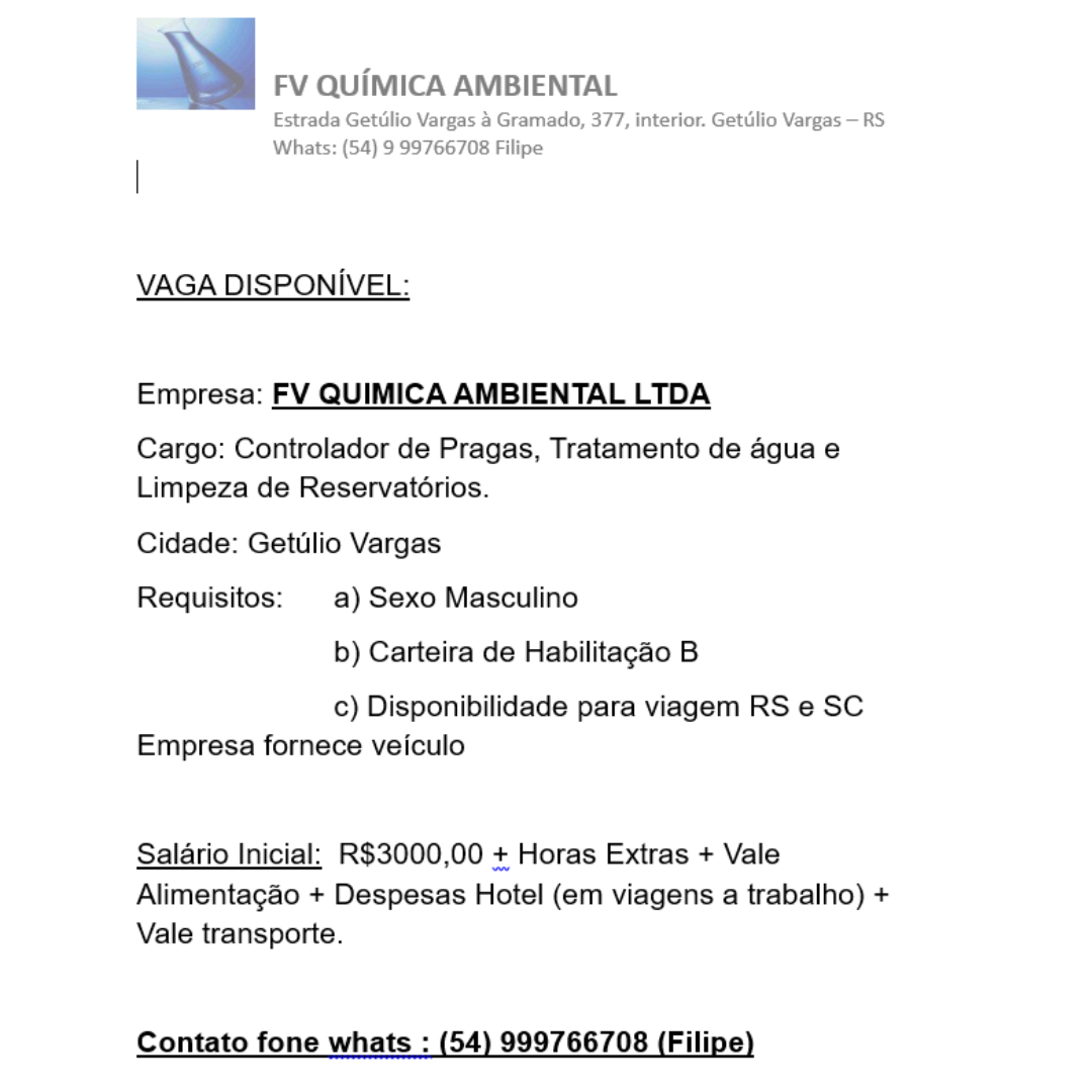 Oportunidade de Emprego – FV QUIMICA AMBIENTAL LTDA