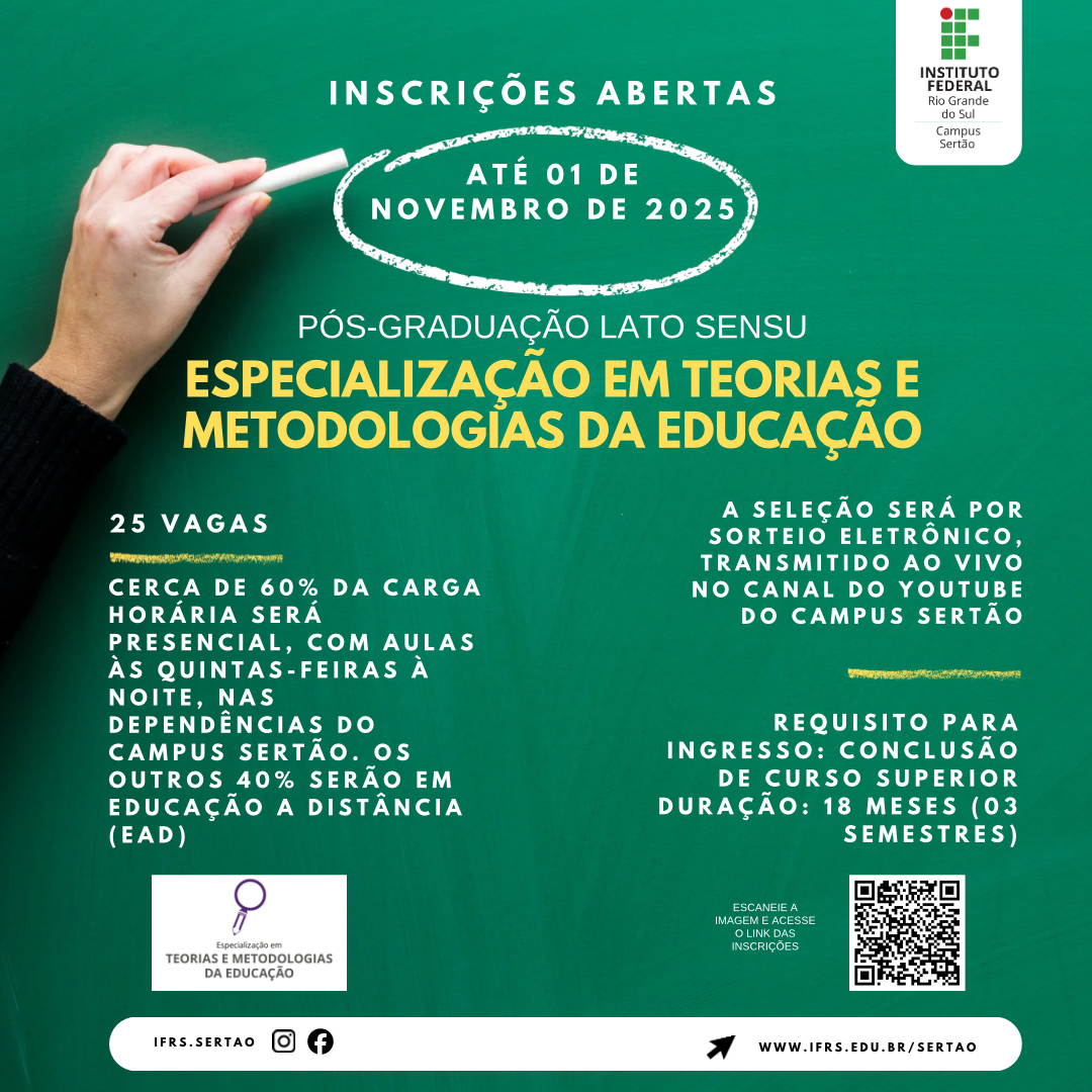 O Campus Sertão está com inscrições abertas para o processo seletivo do curso de Especialização em Teorias e Metodologias da Educação. São 25 vagas disponíveis e as inscrições podem ser realizadas até 1º de novembro de 2025, por meio do Sistema Integrado de Gestão de Atividades Acadêmicas (SIGAA), no endereço eletrônico: https://sig.ifrs.edu.br/sigaa/public/processo_seletivo/lista.jsf?aba=p-lato&nivel=L.