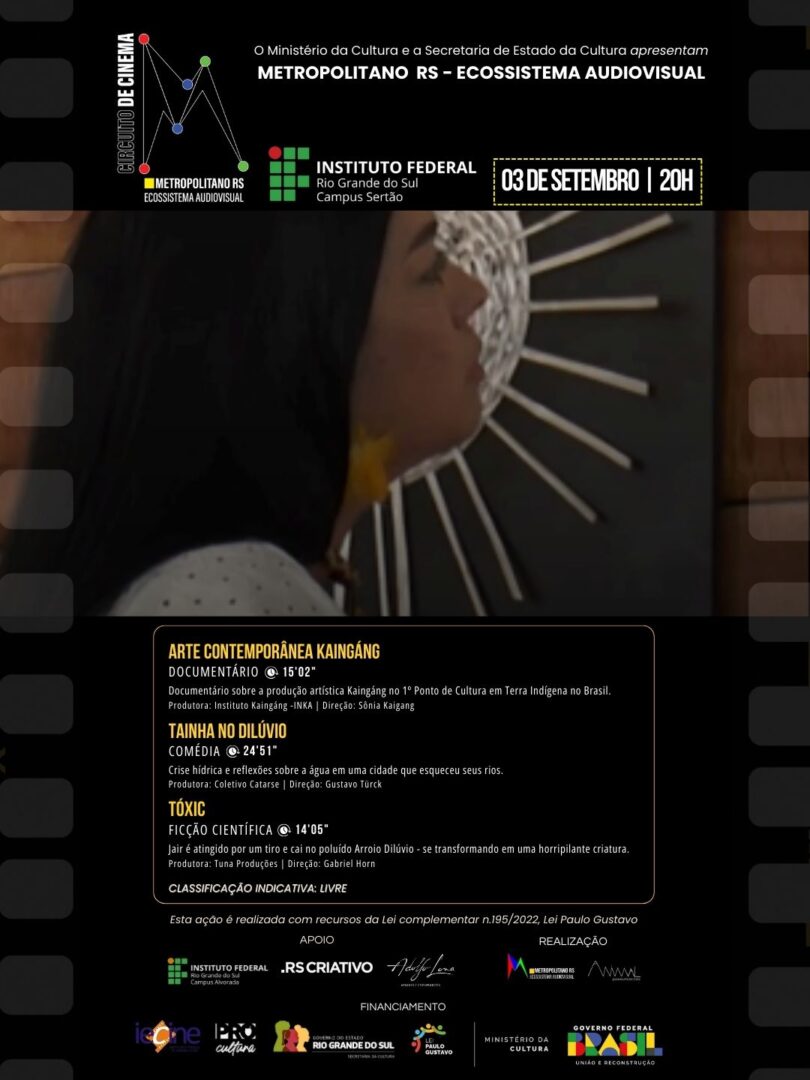 A programação inclui curtas-metragens que abordam questões sociais, ambientais e culturais, com destaque para a exibição do documentário “Arte Contemporânea Kaingang”, que mostra a produção artística no primeiro ponto de cultura em terra indígena do Brasil.
