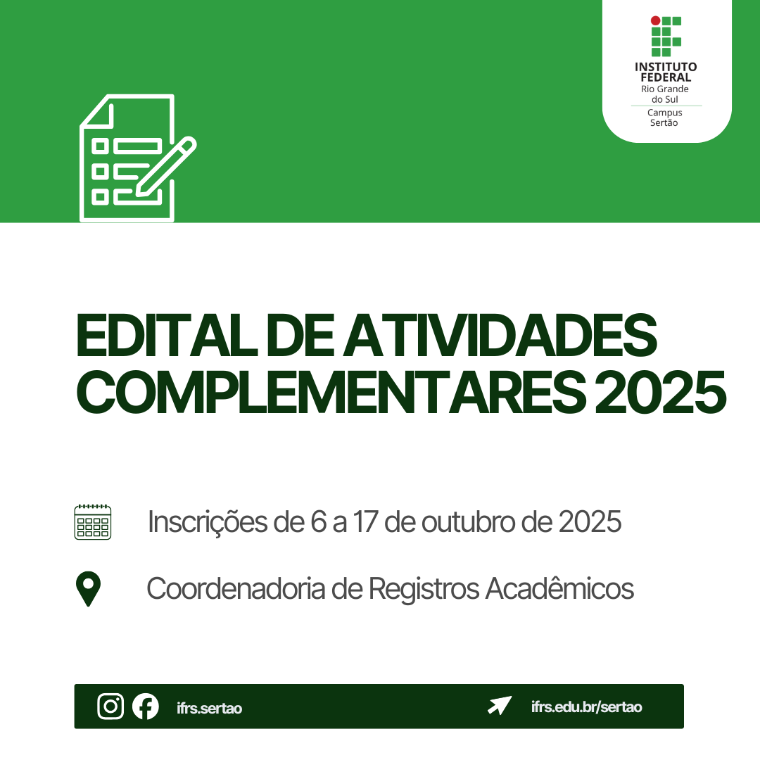 O edital completo, com todas as orientações e formulários, pode ser consultado em: 🔗 https://ifrs.edu.br/sertao/editais/edital-no-37-2025-atividades-complementares-2o-semestre-letivo-de-2025/